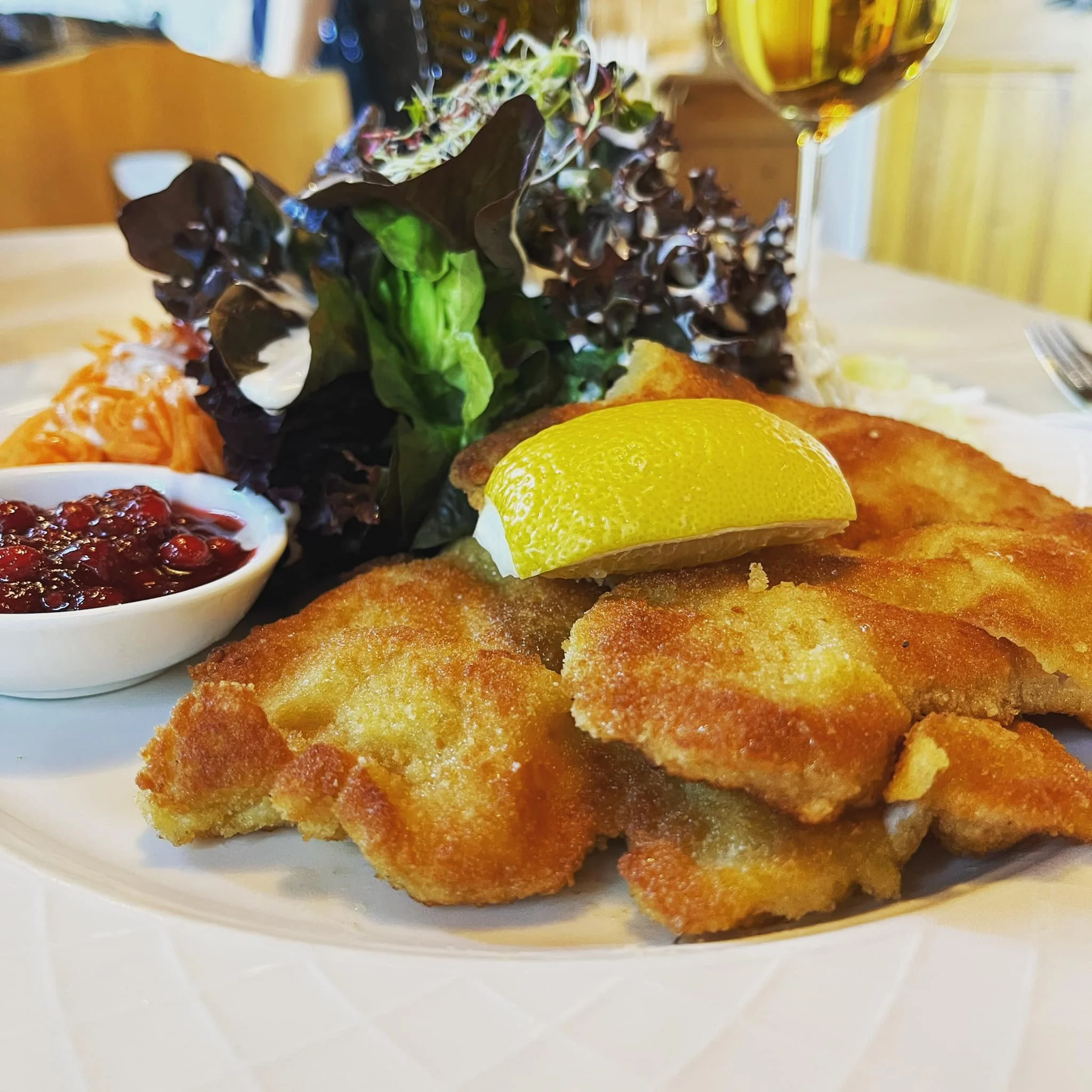 Breaded cutlets (veal or pork), usually served with fries, potatoes, salad or vegetables and cranberry sauce